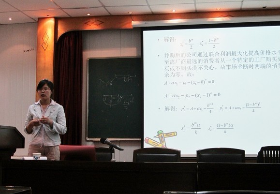 汪香园同学首先以跨国并购为背景,从选址、质量、价格等方面引出跨国并购选题的背景与研究意义,并依据跨国公司实施跨境并购的研究结果分析了贸易自由化、跨国并购的福利效果。然后重点阐述了寡头垄断的四个基本模型,特别是为解决三阶段空间线性所构建的Hotelling模型,紧接着分别从静态、动态的博弈视角得出跨国并购进程中价格、产量因素的函数表达式。在此基础上,汪香园同学进一步分析了实施并购行为在区域间的作用规律。最后利用比较分析法从消费者剩余和社会福利两方面分析了厂商选址的影响因素并得出相应结论。汪香园同学的报告深入浅出,思路清晰严谨,证明过程清晰丰富,博得了同学们的阵阵掌声。