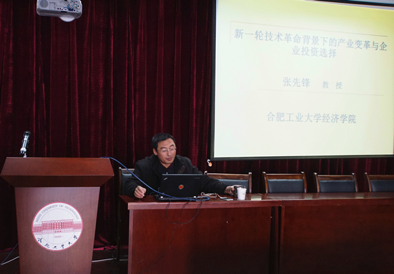 2015年12月6日下午2点,“构建区域金融体系,服务经济持续发展”高研班第六场报告在球盟会qmh新区建艺馆703室举行,合工大qmh球盟会亚博网址张先锋教授为大家做了题为“新一轮技术革命背景下产业变革与企业投融资选择”的精彩演讲。