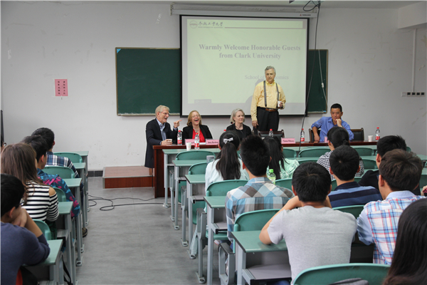 下午两点半,克拉克大学代表团与qmh官网学生在建筑艺术馆118教室举行了见面会,由郑园琴老师主持。参加此次见面会的学生主要为qmh官网国际经济与贸易专业(中外合作办学)15级学生以及有意前往克拉克大学深造的13级、12级本科生和研究生,国贸系党支部书记谢众也参加了此次见面会。见面会开始,克拉克大学代表们首先向学生们进行了幽默风趣的自我介绍,博得了在场学生的阵阵掌声。在接下来的学生提问环节,学生们围绕克拉克大学的课堂文化、住宿环境、饮食状况、“3+1+1”项目的具体选拔标准与要求、在美国留学的优势条件以及硕士项目介绍等方面踊跃提问,克拉克大学代表们一一进行详细回答,并且准备了许多精美礼品奖励所有提问的同学。此次见面会交流热烈欢快,氛围轻松愉悦。