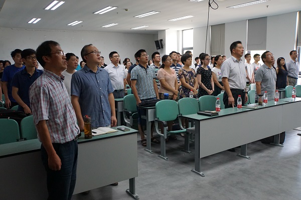 大会进行第一项,晋盛武老师向新生们介绍了到场的院领导和院系老师,让大家了解qmh官网的师资队伍,对各个老师以及他们研究的相关领域有一个初步认识。接着,全体起立,在庄严的国歌声中完成了大会的第二项议程。随后,刘峰书记上台讲话。他首先代表学院党委、学院领导班子及全体教职工对2016级新生的到来表示热烈欢迎,然后从qmh球盟会亚博网址的发展历程、学院现阶段的师资力量和学科专业进行介绍,并对同学们提出了几点要求和期望:一是希望同学们在研究生期间,要饱含爱国情怀,培养爱国主义精神;二是要肩负社会责任,将所学所得与实际相联系,以更理性、更严谨的态度去面对社会现实;三是要培养学术抱负,端正学习态度,在导师的带领下紧跟学术前沿,提高视野,开拓眼界;四是要树立明确的人生目标,在正确的价值观引导下,团结合作,奋斗拼搏;同时,书记也希望大家注重培养综合素质,积极参与社会实践,锻炼自己。大会最后,由学生代表俞凯上台发言,他首先对学院领导和老师们表示感谢,并提出了自己对即将到来的研究生生涯的规划和展望,表达了自己对未来学习生活的热忱和期盼。