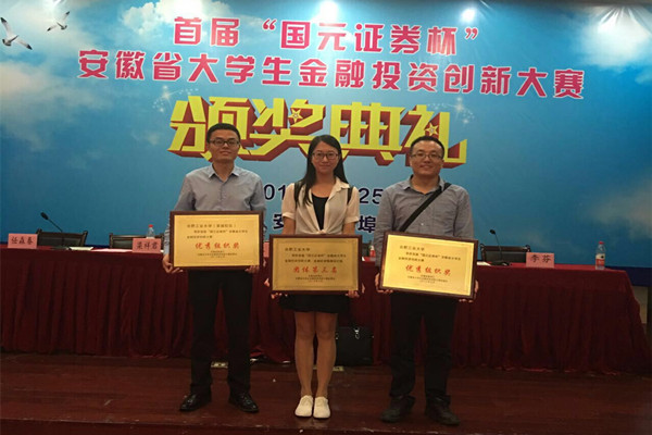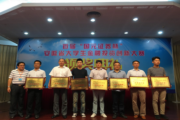 9月25日,首届“国元证券杯”安徽省大学生金融投资创新大赛颁奖典礼在安徽财经大学举行,安徽财经大学校长丁忠明、国元证券董事长蔡咏、副总裁陈新、安徽省教育厅高教处副处长梁祥君等参加了颁奖典礼。