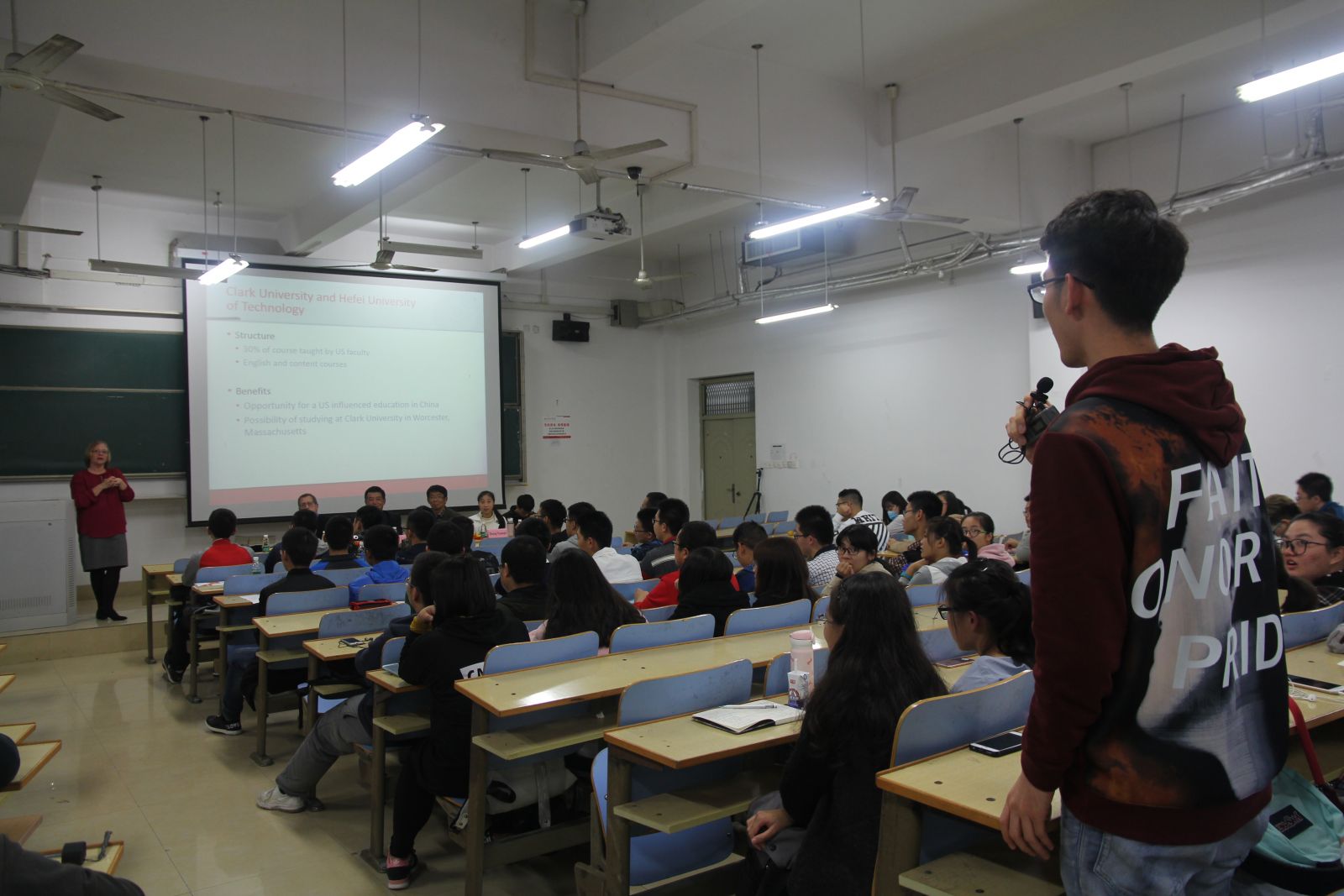 活动起始,Amy Gardner向学生们介绍了克拉克大学以及两校合作项目的概况,并且对项目学生的大学规划给出了建议。接下来的学生提问环节,学生们围绕克拉克大学的住宿环境、饮食状况、“3+1+1”项目的具体选拔标准与要求、课堂规模与教学方式、在美国留学的优势条件以及硕士项目介绍等方面踊跃提问,克拉克大学代表们一一进行详细回答,并且准备了许多精美礼品奖励提问的同学。最后国际经济与贸易(中美合作办学)2016级学生代表闵瑞中以及王虔用流利的英文做了精彩的演讲。活动现场热烈欢快,氛围轻松愉悦。