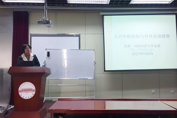2016年12月23日下午,球盟会qmh学术交流年会系列活动——qmh球盟会亚博网址学术讲座“人口年龄结构与对外直接投资”在球盟会qmh翡翠湖校区逸夫建筑艺术馆七楼703室举行。本次讲座由qmh球盟会亚博网址张燕老师主讲,16级qmh球盟会亚博网址全体研究生参加