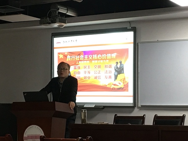 随后胡晓浩老师向同学们介绍了社会主义核心价值观的发展历程,展现了社会主义核心价值观的丰富内容,并且指明积极培养和践行社会主义核心价值观的现实意义。