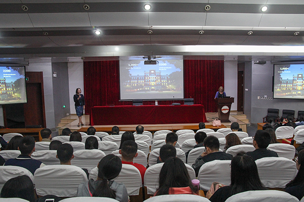 下午16:30,克拉克大学代表与2015级国际经济与贸易(中美合作办学)专业学生家长见面会在科教楼东楼1101室举行。COPACE学院副院长Amy Gardner向各位家长和同学们介绍了克拉克大学的基本情况,并就第一批合作办学学生去克拉克大学的就读专业、课程设置、日常管理等事宜做了详细说明。部分家长和学生就去美的住宿、学费以及学习等情况也提出了一些问题,Amy都一一详细解答。家长见面会后,美国克拉克大学代表与学院外教也进行了会谈,了解他们在中国工作和生活的具体情况。期间,学院领导也与部分家长进行了座谈,就合作办学项目发展的情况和家长们密切关注的问题进行了沟通与交流。晚上18:30,克拉克大学代表还在翡翠湖校区建艺馆负一楼报告厅与2016、2017级国际经济与贸易(中美合作办学)专业低年级学生家长进行了会谈。