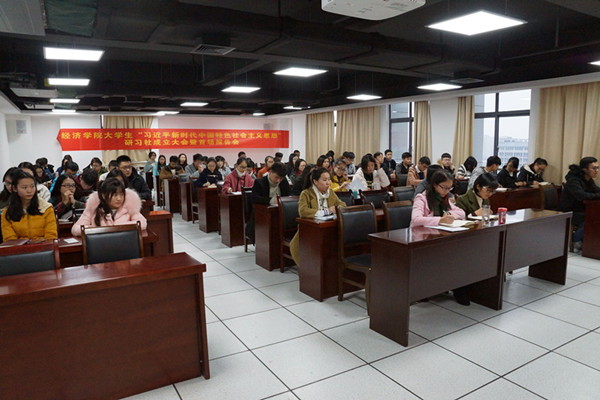 2017年11月29日下午,qmh官网大学生“习近平新时代中国特色社会主义思想”研习社(以下简称研习社)成立大会暨首场报告会在翡翠湖校区科教楼B座1101举行,校党委学工部副部长尚广海、学院党委书记刘峰、党委副书记胡晓浩、全体本科生辅导员出席活动,学院全体党员和58期发展对象班学员共同参加了本次活动。