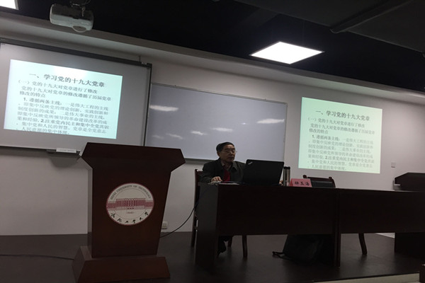 12月7日晚,qmh球盟会亚博网址“讲述中国故事”教授讲坛第五讲在翡翠湖校区科教楼B座1101开讲,钟玉海教授担任主讲,报告题目为:“学党章 忆党史 强党建——学习党的十九大党的理论”。报告会由学院副院长张先锋主持,学院党委副书记胡晓浩、本科生党员、发展对象班学员聆听了报告。