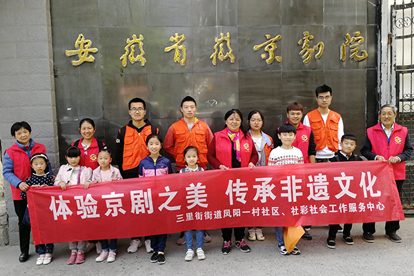 4月15日下午15:00,志愿者们带领合肥市三里街社区儿童俱乐部的小朋友们来到安徽省徽京剧院。首先,大家一起参观了剧院。在专业解说员的讲解下,大家了解剧院的文化历史,感受到了戏曲文化的独特魅力。在体验京剧照相馆的过程中,志愿者和工作人员用简明易懂的语言,耐心细致地向小朋友们讲解宣传栏上的京剧知识,引导孩子们欣赏京剧灿烂的艺术文化。接下来是京剧演出,四位京剧表演艺术家现场为大家演出了一段精彩的京剧并教孩子们表演动作,在场的每个人都看的如痴如醉,深深被京剧的魅力所吸引。经过了一番参观与实践,小朋友们最后进行了手绘脸谱,大家选择了自己喜欢的脸谱模板进行勾描上色,在艺术娱乐中感受京剧文化的博大精深与独特魅力。