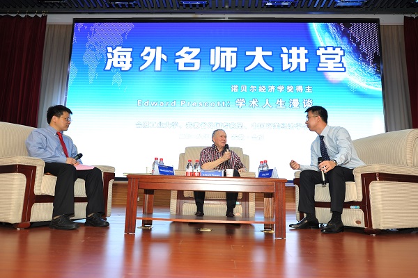 Edward Prescott教授与我们分享了他的求学经历、学术道路与人生感悟。回顾过去的学术生涯,他提到学术研究的过程并不是一帆风顺的,一个问题的解决往往要耗费多年,重要的是坚持,和与团队成员的沟通合作。同时,他还给在座的学生们提出了一些学术方面的建议:1.要时刻保持诚实;2.永远不要低估你自己,只要坚持努力就一定能成功;3.要有冒险精神,时刻保持怀疑的态度、批判的精神。