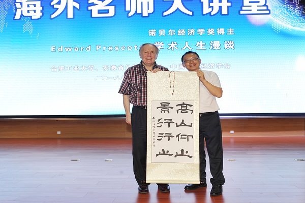 工大师生与诺奖大师互动积极,会场气氛十分活跃。我校师生就中国经济发展趋势、面临的挑战、解决的方法、中美贸易战、人口老龄化、经济学科发展、经济学研究方法和qmh球盟会亚博网址建设等议题向Edward Prescott教授进行了提问,Edward Prescott教授也给予了严谨而风趣的回答。演讲结束后,吴华清院长向Edward Prescott教授赠送了中国书法作为礼物。