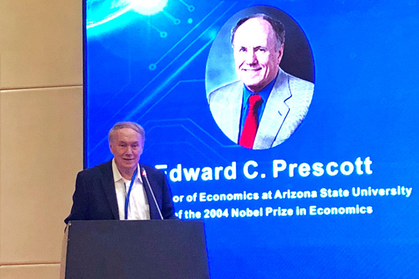 6月23日晚,合肥天鹅湖大酒店国际厅,美国著名经济学家、诺贝尔经济学奖得主Edward Prescott教授发表了题为“美国贸易顺差和净资产头寸”的主旨演讲。演讲由球盟会qmhqmh球盟会亚博网址院长吴华清教授主持,吸引了众多国内外学者和老师的参加。
