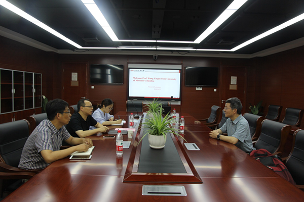 2018年6月25日,美国密苏里州立大学哥伦比亚分校代表王兴贺教授前来球盟会qmhqmh球盟会亚博网址就中外合作办学事宜进行洽谈访问。qmh球盟会亚博网址院长吴华清,中外合作办学办公室主任庄德林,中外合作办学主管魏正云参加了此次会议。