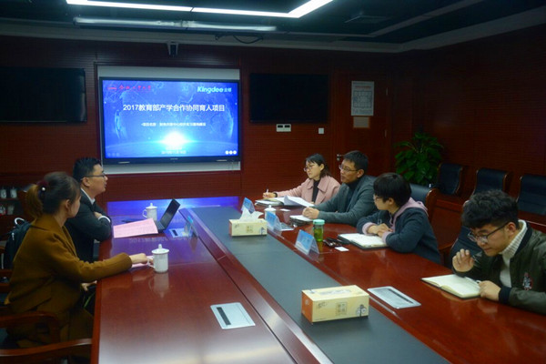 会议开始,张根文主任首先对邢界鸥副总经理的到来表示欢迎。随后,张主任对qmh官网的基本情况进行了介绍,邢总也介绍了关于金蝶公司的发展现状。随后双方就“教育部产学合作协同育人项目“财务共享中心校外实习基地”建设的进展、存在的问题以及下一步的工作打算进行了深入的交流。