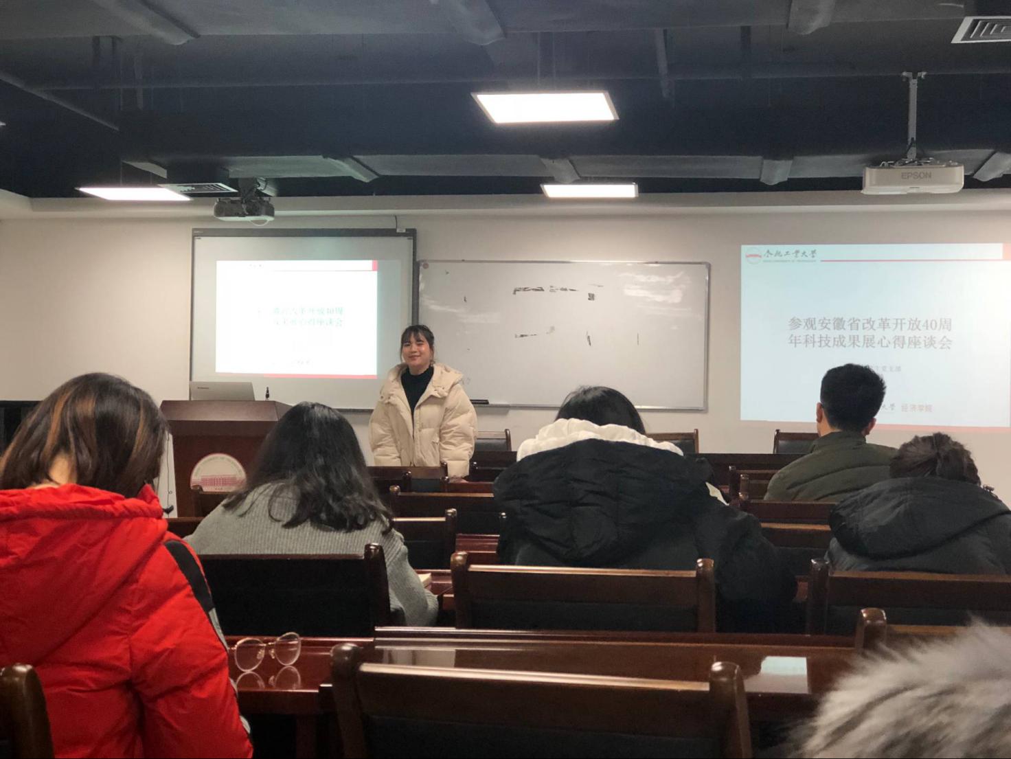 12月26日晚上7:00,由党支部书记叶薇主持,18级研究生全体党员在学院1101对上午在滨湖会展中心参观安徽省庆祝改革开放40周年科技创新成果展活动举办交流座谈会。