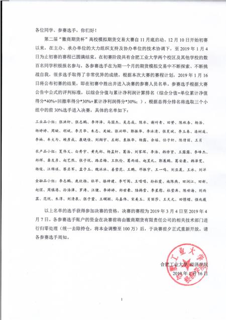 安徽各高校数百名参赛大学生,在这一个月的期货模拟交易中不断探索、不断挑战自我,很多选手取得了非常优异的成绩。此轮比赛结果依据的评判标准是以综合得分和累计净利润计算排名。根据总得分排名将选取三个小组中的前30%选手进入决赛。截止到2019年1月16日,初赛的结果已全部统计出来。(决赛最终晋级名单见下图或链接),恭喜冲进决赛的所有同学,希望大家在决赛再接再厉。也希望未进入决赛的同学能吸取经验,来年再战。