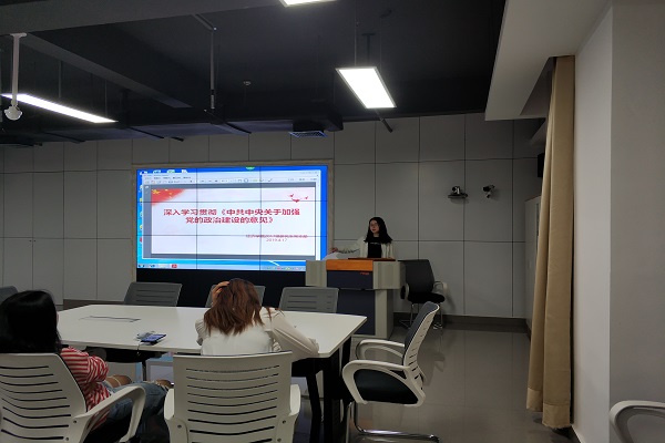 胡甜甜同志汇报了此次党课支部党员与会情况后,会议正式开始。胡甜甜同志从四个方面解读《意见》。首先,胡甜甜支部书记对《意见》进行简要概述,《意见》于2019年1月25日经过中国共产党中央委员会审议,2月发行,共分为6章,20条。其次,介绍《意见》发行的背景意义,在党的十九大中强调了党的政治建设是党的根本性建设,要以党的政治建设为统领全面推进党的各项建设。在这种背景下,《意见》的出台实施是全面从严治党向纵深发展的内在需要,是坚持和加强党的全面领导的必然要求。接着,解读《意见》内容,《意见》指出,要坚持用党的科学理论武装头脑,坚定执行党的政治路线,坚决站稳政治立场,增强党组织政治功能,坚决做到“两个维护”,完善党的领导体制,改进党的领导方式,彰显国家机关政治属性,发挥群团组织政治作用,强化国有企事业单位政治导向,提高党员干部政治本领,严肃党内政治生活,严明党的政治纪律和政治规矩,发展积极健康的党内政治文化,突出政治标准选人用人,永葆清正廉洁的政治本色等。最后,强调《意见》的学习贯彻和落实,从落实领导责任,抓住“关键少数”,强化制度保障,加强监督问责等方面,对各地区各部门推进党的政治建设提出相应要求。