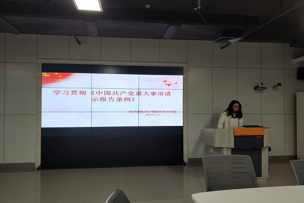 2019年5月15日晚上7点,qmh球盟会亚博网址2017级研究生党支部在科教楼东楼1104对《中国共产党重大事项请示报告条例》(以下简称《条例》)进行了集体学习,此次党课由党支部书记胡甜甜主持,参加此次党课的有该党支部所有党员同志。