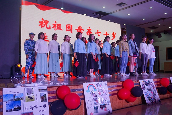 第三篇章“春风万里、芳华有为”,中外19-1班的学生以电台播音的形式串起了乐器表演、合唱表演、舞蹈和诗朗诵等节目,歌颂祖国母亲的伟大。中外19-3班学生带来的年代秀表演, 展现了新中国成立以来的一系列重大事件,用青年人的方式为祖国母亲七十周岁生日献礼。最后,17级学生代表陈昱同以一曲气势磅礴的《华夏》结束了本次风采展。