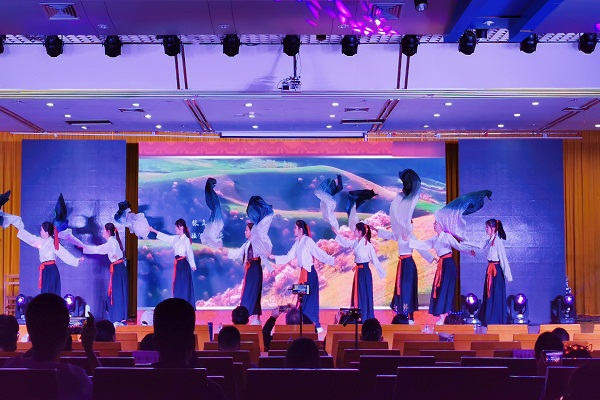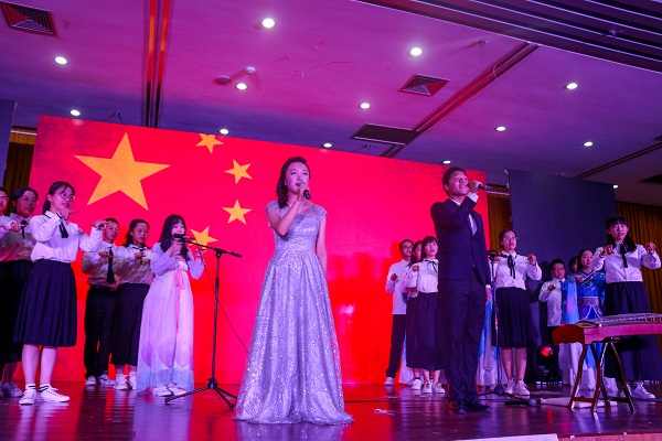 第一篇章“炎黄浩瀚、锦绣中华”,金融工程19-1班的歌舞《千年华夏》,古典唯美,展现了中华传统文化的魅力。中外19-2班的节目《我和我的祖国》,通过归国音乐家的对话,引出了一曲曲动听的音乐、一段段曼妙的舞蹈,展现了中西文化碰撞交流的美。19级学生代表的诗朗诵更是表达了对祖国的无限赞美与热爱。