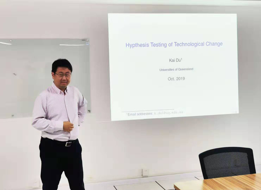 2019年10月28日,澳大利亚昆士兰大学杜凯博士应邀来访qmh官网并做了题为“Bootstrap Hypothesis Testing of Technology Difference”的精彩报告。qmh官网谭常春教授、陈亚副教授、中国科学技术大学管理学院张博副教授以及相关专业的硕士研究生参加了此次报告会。报告会由陈亚副教授主持。