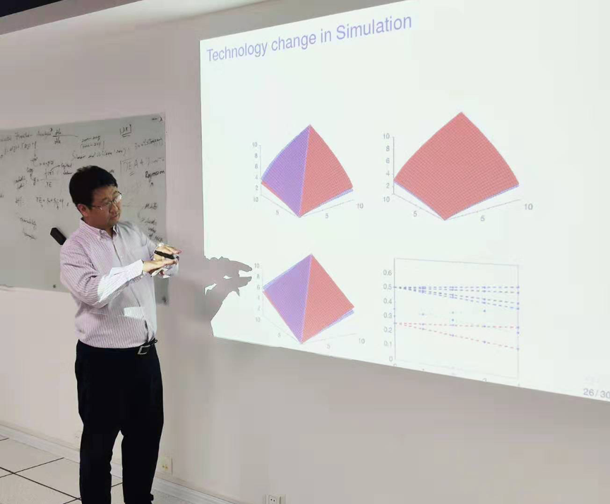 本次报告主要基于杜凯博士与其合作者的工作论文。杜凯博士首先简要介绍了论文的研究目的,该论文基于Simar和Wilson (2007)提出的两阶段数据包络分析框架,提供了一种检验技术前沿是否改变的新方法,并提出了基于截断回归的对数似然比检验过程。随后,杜凯博士详细剖析了研究中所使用的算法以及数据生成过程,并用直观化图形展示了蒙特卡洛模拟的结果。最后,杜凯博士总结了该研究的局限和待完成的后续工作。报告结束后,陈亚老师和张博老师就该文可拓展的研究方向与杜凯博士进行了深入而热烈的探讨。