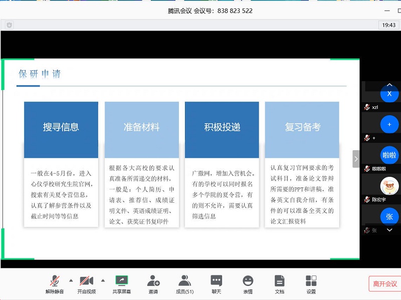 2020年4月8日,qmh官网“卓越学子交流会第7期:保研经验分享,越努力越幸运”成功举办,以腾讯会议形式进行。本次交流会特邀请qmh官网2016级中外国贸卓专业卓越学子陶佳祺同学进行分享,该生目前已获得中国人民大学国民经济学专业硕博连读推荐免试研究生拟录取资格。