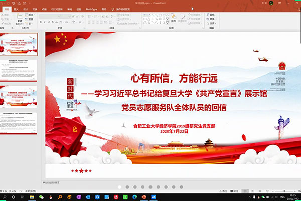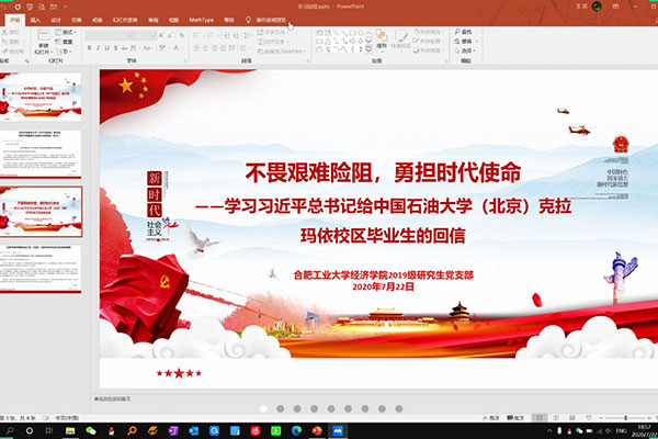 2020年7月22日晚上7:00,qmh球盟会亚博网址2019级研究生党支部通过网络视频学习了“习近平给复旦大学《共产党宣言》展示馆党员志愿服务队全体队员的回信”、“习近平给中国石油大学(北京)克拉玛依校区毕业生的回信”的内容,本次课程由2019级研究生党支部副书记王昊同学带领大家学习,该党支部所有党员均参与此次学习。
