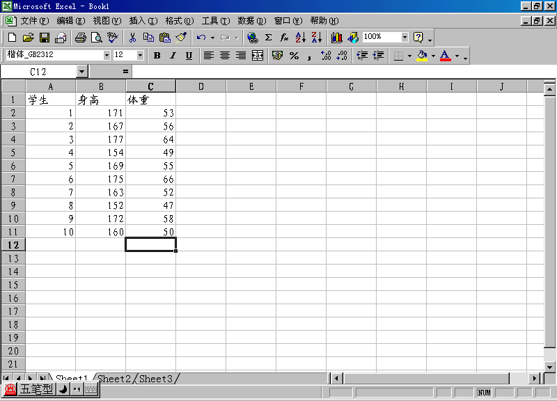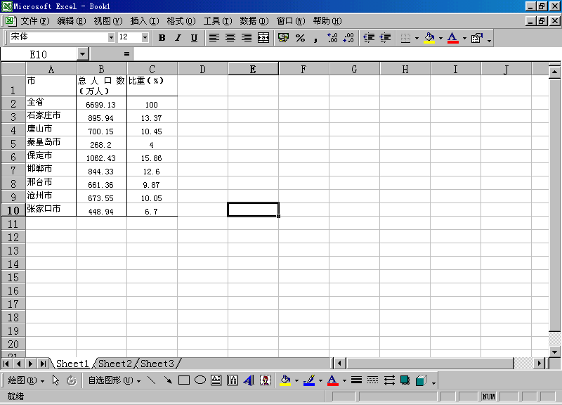 【例3】看一下如何作饼图。首先把数据输入到工作表中,如图1-6所示: