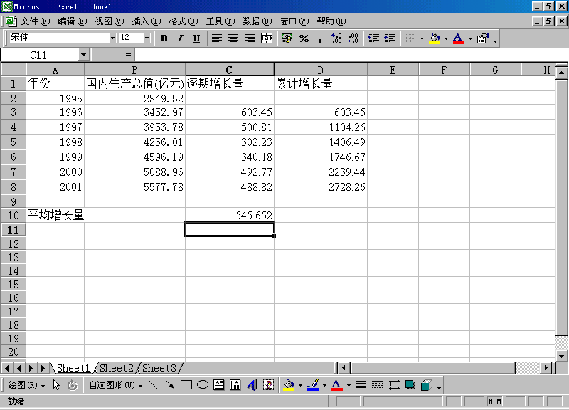【例5】:根据1995-2001年河北省国内生产总值,计算逐期增长量、累计增长量和平均增长量。如图1-12