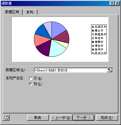 第三步:在源数据对话框中填入数据所在区域,单击完成按钮,即可得如1-9所示的饼图: