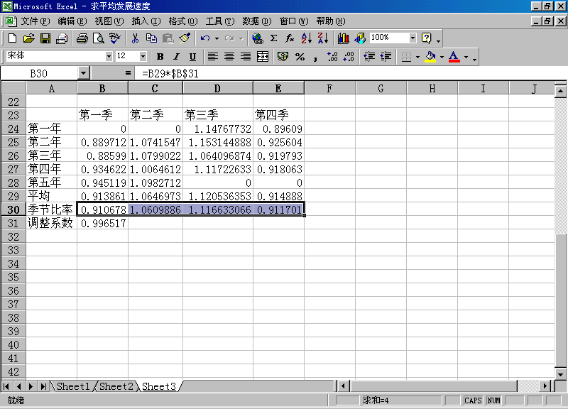 第八步:计算季节比率:在B30中输入公式:=B29*$B$31,并用鼠标拖曳将公式复制到单元格区域B30:E30,就可以得到季节比率的值,具体结果见图1-16: