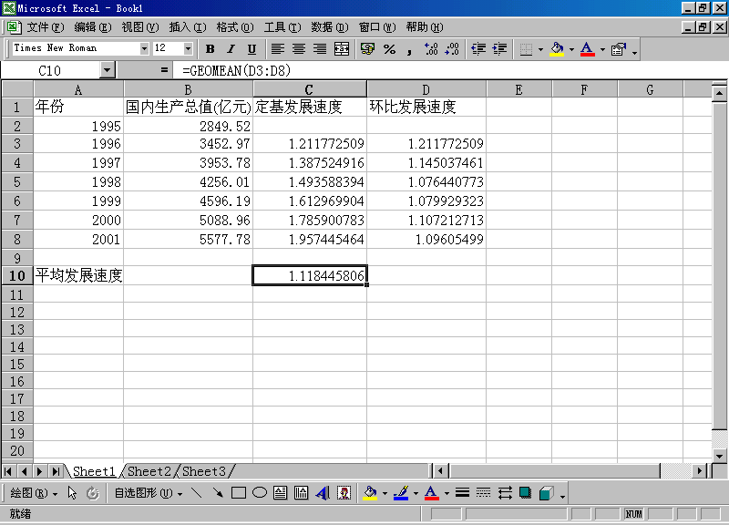 【例6】:以1995-2001年河北省国内生产总值为例,说明如何计算定基发展速度、环比发展速度和平均发展速度。如图1-13