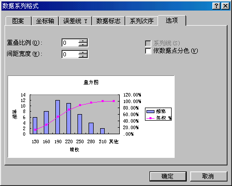 在对话框中选择选项标签,把间距宽度改为0,按确定后即可得到直方图,如图1-5所示: