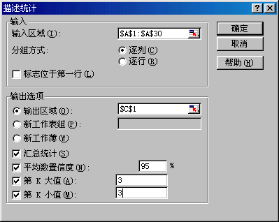 第二步:在输入区域中输入$A$1:$A$30,在输出区域中选择$C$1,其他复选框可根据需要选定,选择汇总统计,可给出一系列描述统计量;选择平均数置信度,会给出用样本平均数估计总体平均数的置信区间;第K大值和第K小值会给出样本中第K个大值和第K个小值。