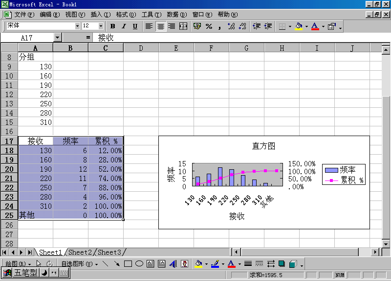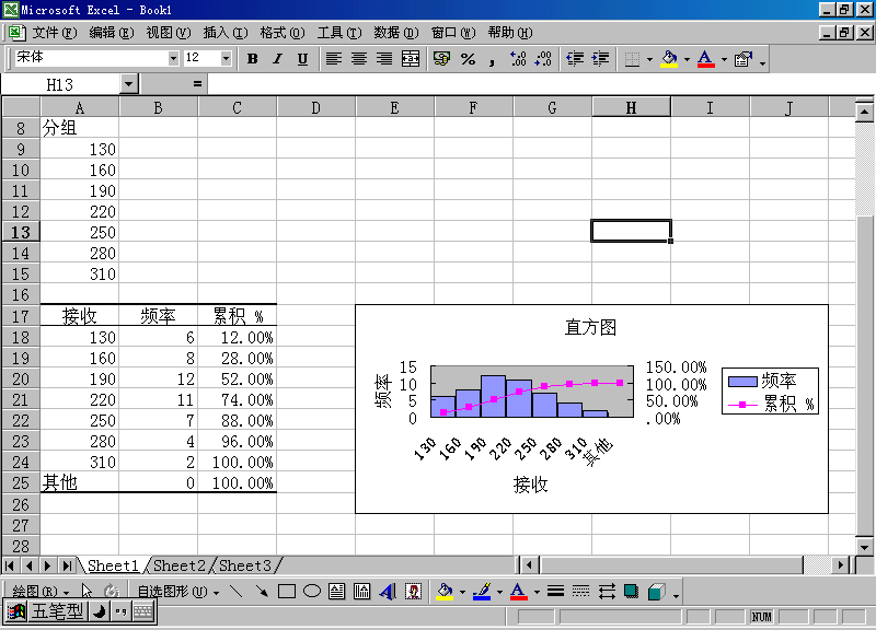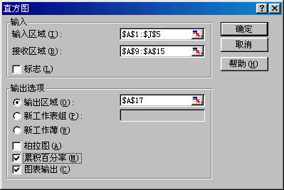 第四步:选择图表输出,可以得到直方图;选择累计百分率,系统将在直方图上添加累积频率折线;选择柏拉图,可得到按降序排列的直方图。