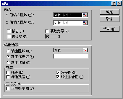 第二步:单击确定按钮,弹出回归对话框,在Y值输入区域输入$B$2:$B$11,在X值输入区域输入$C$2:$C$11,在输出选项选择新工作表组,如图10所示: