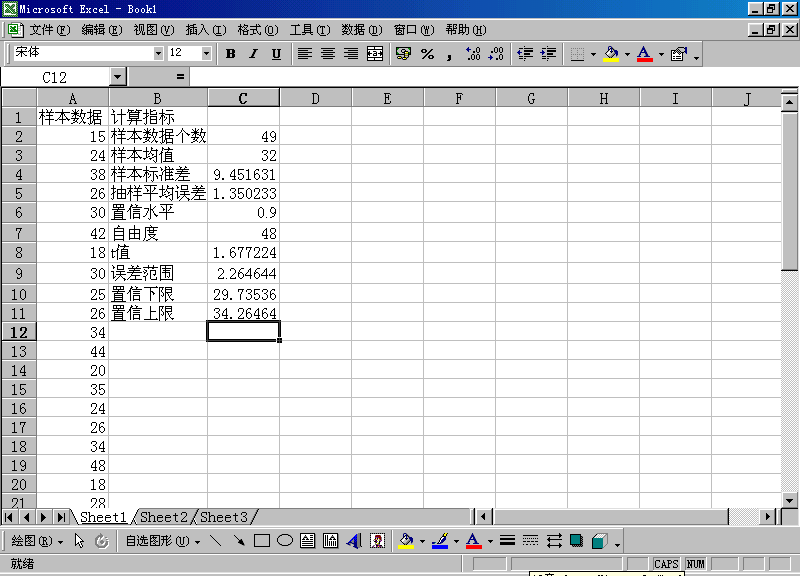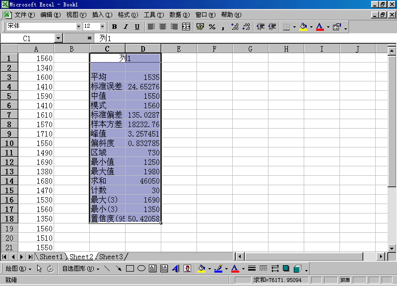 单击任一单元格,输入“=STDEV(A1:A30)”,回车后得标准差为135.0287。