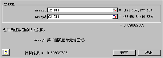 第二步:在array1中输入B2:B11,在array2中输入C2:C11,即可在对话框下方显示出计算结果为0.896。如图6所示: