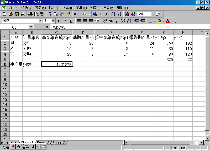 第五步:计算产量指数:在C7中输入“=H5/G5”,即得产量指数