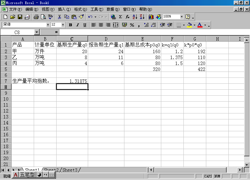 第六步:计算单位成本指数:在C8中输入“=I5/H5”即求得单位成本指数