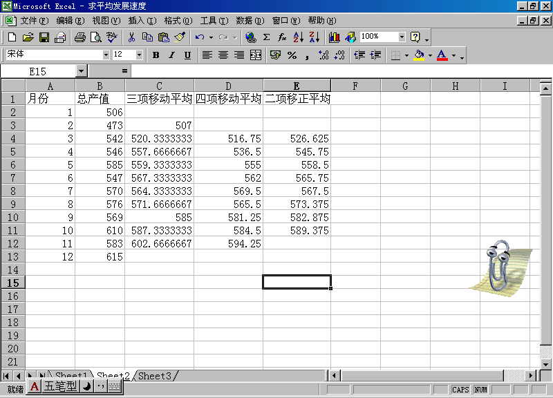 第三步:计算趋势值(即二项移动平均)T:在E4中输入“=(D3+D4)/2”,并用鼠标拖曳将公式复制到E4:E19区域。