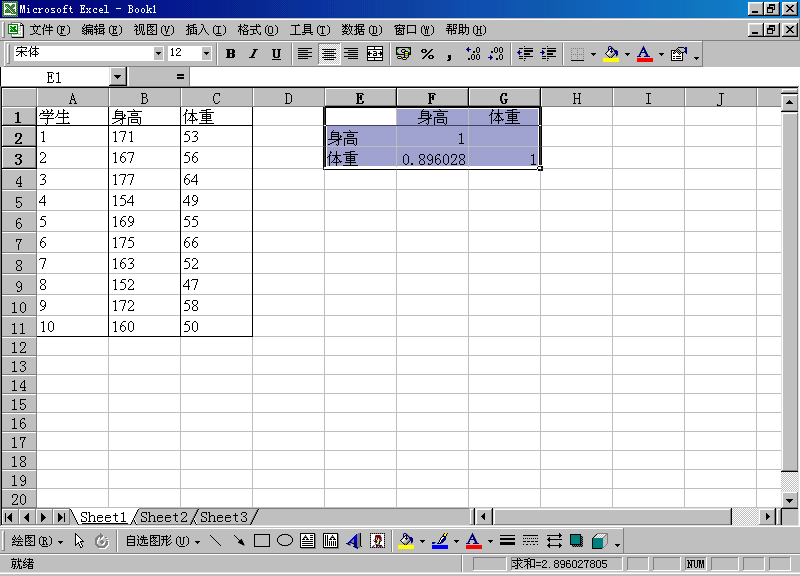 在上面的输出结果中,身高和体重的自相关系数均为1,身高和体重的相关系数为0.896,和用函数计算的结果完全相同。