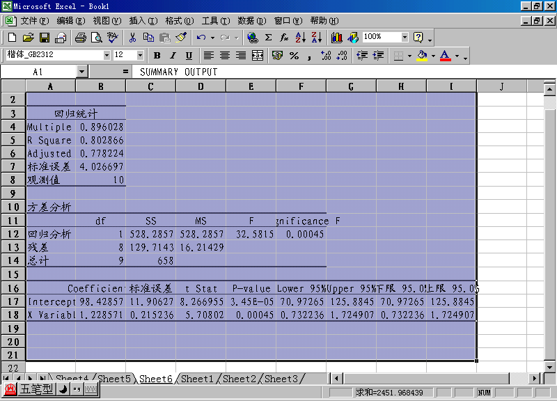 在上面的输出结果中,第一部分为汇总统计,MultipleR指复相关系数,R Square指判定系数,Adjusted指调整的判定系数,标准误差指估计的标准误,观测值指样本容量;第二部分为方差分析,df指自由度,SS指平方和,MS指均方,F指F统计量,Significance of F指p值;第三部分包括:Intercept指截距,Coefficient指系数,t stat指t统计量。