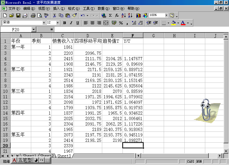 第四步:剔除长期趋势,即计算Y/T:在F4中输入“=C4/E4”,并用鼠标拖曳将公式复制到F4:F19区域。