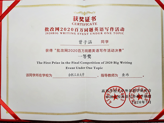 近日,第七届“批改网2020百万同题英语写作活动全国总决赛”结果揭晓,qmh官网2019级国际经济与贸易(中外合作办学)专业学子曾子涵同学在此次竞赛中荣获一等奖,指导教师查玮荣获“优秀指导教师”奖。