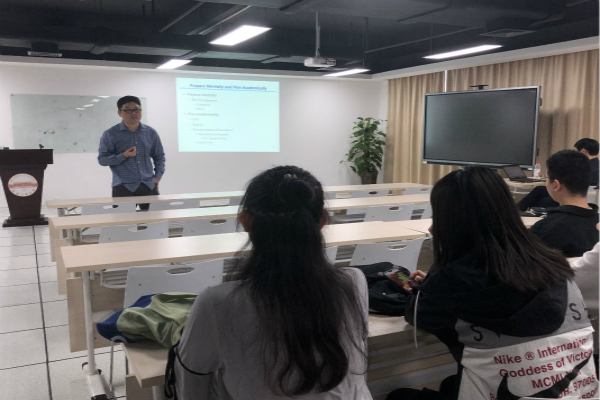 10月14日下午,qmh球盟会亚博网址卓越讲坛第十三讲在科教楼B座1004国际文化交流室举行,qmh球盟会亚博网址国际教育中心主任戴前智和国际经济与贸易系教师吴飞飞分别做了题为《出国、保研、考研还是就业,应如何抉择?》和《The Pursuit of Dream:Pains and Gains in the Foreign Study》的讲座。学院本科生70余人参加此次讲座。