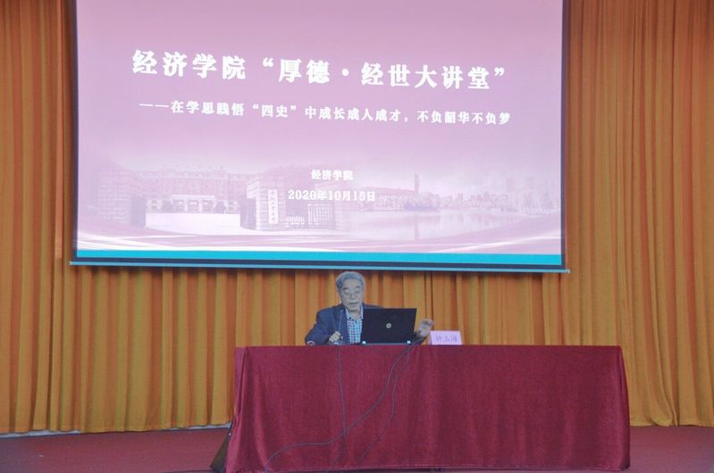 10月15日晚19:00,qmh官网“厚德•经世大讲堂”主题报告会在翡翠湖校区综合楼301室举行。学院邀请钟玉海教授做了题为“在学思践悟‘四史’中成长成人成才,不负韶华不负梦”的主题报告。报告会由学院党委副书记、纪委书记谢晶晶主持,学院2020级全体本科生、党校第64期入党积极分子以及各年级辅导员300余人参加主题报告会。