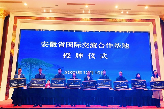 12月10日,安徽省国际交流合作基地授牌仪式在巢湖举行,我校获评首批安徽省国际交流合作基地。
