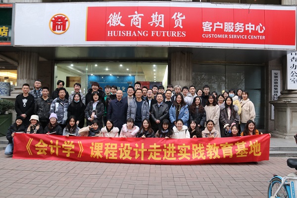 2020年12月23日课题组成员张根文亲率2018级42名金融工程专业本科生第二站来到安徽徽商期货有限公司开展实地教学。徽商期货董事长吴国华先生接待了全体师生。徽商期货财务总监朱建明先生结合企业实际介绍了期货公司会计核算的内容、报表体系、以及监管要求和会计信息披露内容的特殊性,讲授过程结合本企业实际发生的业务,生动形象,内容丰富,深受同学们喜爱。随后全体师生参观了公司研究所、荣誉墙、客服中心并合影留念。