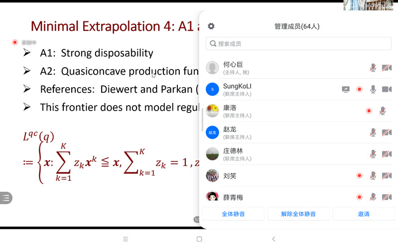 在给出规模报酬、连续性等基本概念以后,李教授分别介绍了传统VRS生产函数、严格S形生产函数、QCVRS生产函数和SS形生产函数成立的前提条件,接着给出了VRS生产函数(2019)的定义,并指出这种函数形式的缺点。接着李教授提出了VRS生产函数新的定义,并提出了六个假定条件对新模型做进一步推广,介绍了在各种情况下,新VRS生产函数的具体形式以及如何估计。